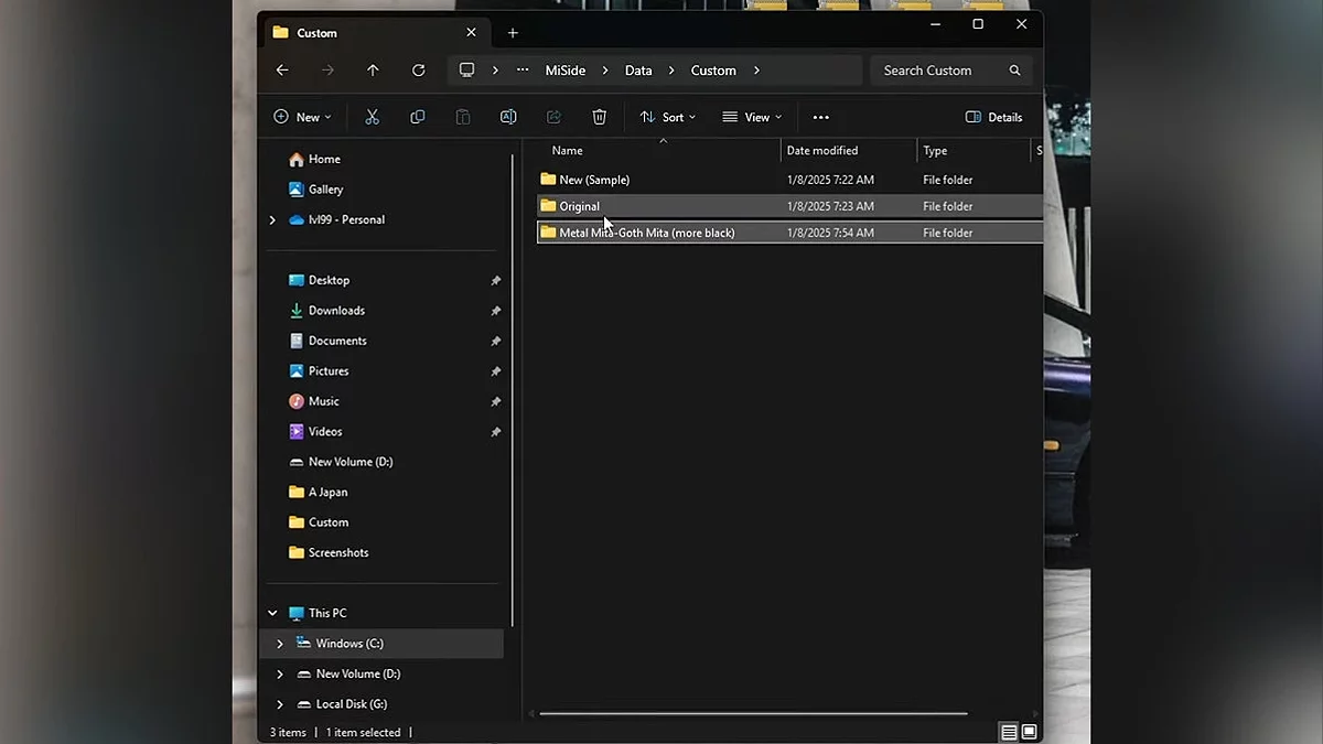 Cukup tambahkan folder dengan skin yang kami butuhkan untuk Mita di sana. Itu akan muncul dalam permainan sebagai gaya untuk penampilan standar Mita.