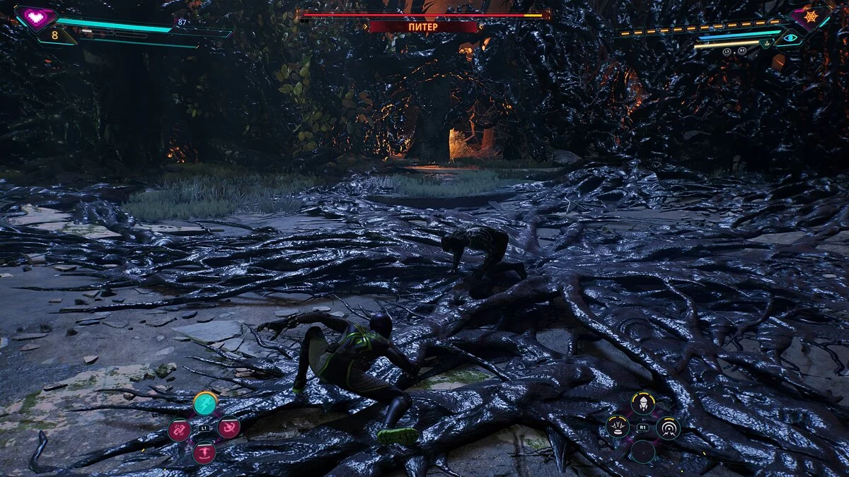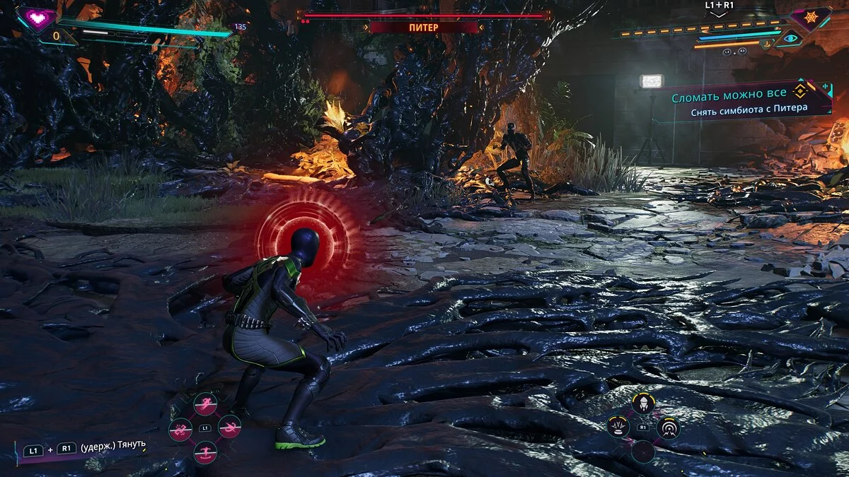 Fase kedua pertempuran hampir tidak berbeda dari yang pertama. Di tahap ketiga, Peter akan memiliki serangan kuat dengan lemparan energi gelap. Tapi Anda bisa memantulkan serangan ini dan melemparkannya kembali dengan kombinasi tombol L1+R1.