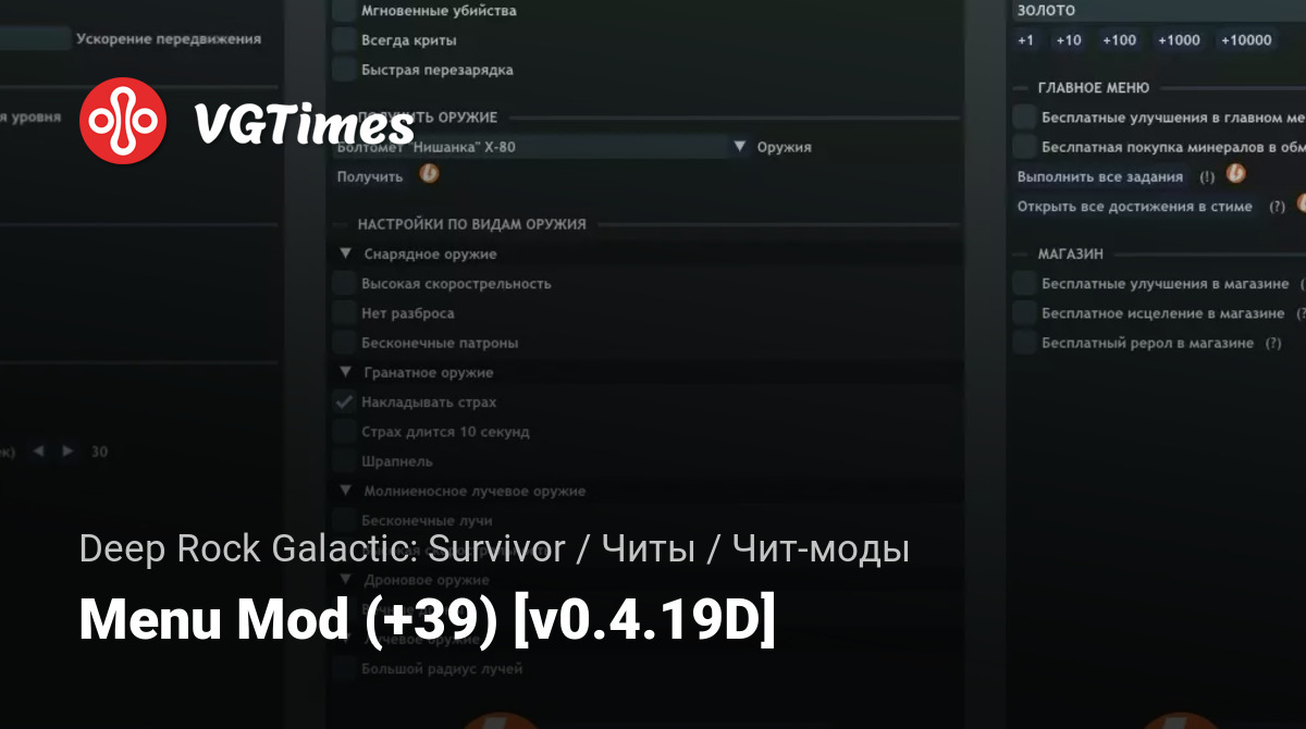 Внутриигровое меню с функционалом чита для игры Deep Rock Galactic: Survivor под Windows. Работа меню проверена только на стимовской версии.