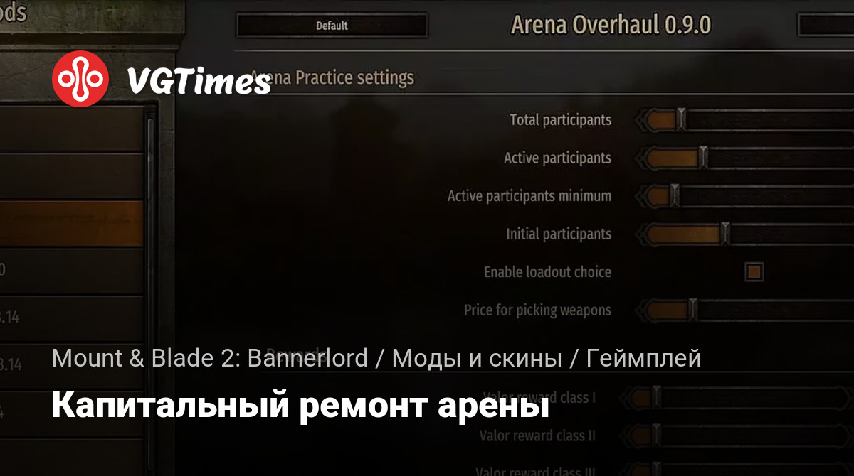 - Возможность выбора снаряжения оружия для тренировочных боев на арене (идея и некоторые части реализации взяты из мода mewhi's Arena Expansion ).