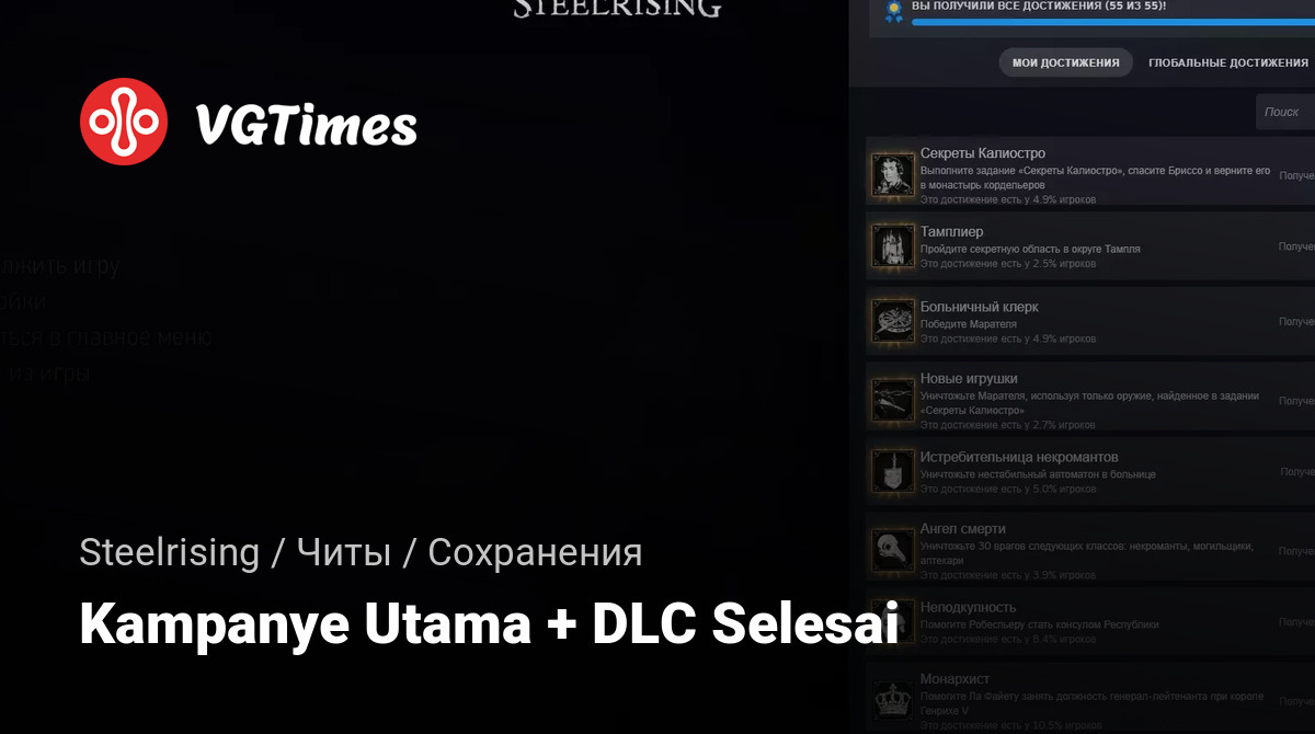 Simpan Steam untuk permainan Steelrising. Kampanye utama + DLC telah diselesaikan. Semua pencapaian telah dikumpulkan. Hanya misi tambahan yang belum diselesaikan, yang mempengaruhi akhir cerita, dan tugas akhir utama "Cek dan Mat". Juga tersedia 1 orichalcum untuk peningkatan hingga +5. Jejak terakhir Atenais ditemukan saat menyelesaikan tugas akhir.