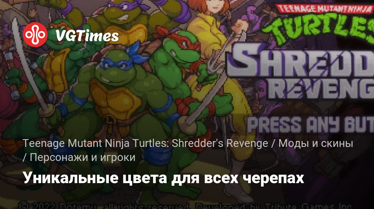 Это новые палитры для четырех черепах, на 100% совпадающие с точными значениями цвета, которые использовались в игре SNES Turtles In Time 1992 года для ее «комических» скинов. Эти палитры на самом деле были основаны на цветах классической линии игрушек Playmates, так что ностальгия с ними сильна!