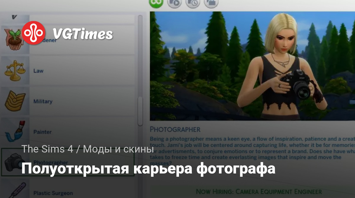 Быть фотографом — значит иметь наметанный глаз, приливы вдохновения, терпение и креативность. Ваша работа будет сосредоточена на том, чтобы запечатлеть жизнь — для того, чтобы сохранить воспоминания или использовать материал в рекламе, чтобы вызвать эмоции или создать образ какого-то бренда. Есть ли у вас задатки, требующиеся тому, кто хочет создать вневременные изображения, способные повлиять на людей? Это десятиуровневая полуоткрытая карьера, то есть, ваши персонажи смогут работать и из дома, выполняя задания! Деньги, которые они получают за выполнение своих повседневных задач, будут эквивалентны зарплате при работе в кроличьей норе. Если вы работаете из дома, то вы получите 4 задания!