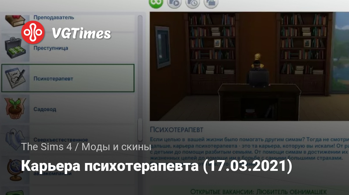 Карьера терапевта с 5 различными направлениями: социальный работник, лайф-коуч, брачный консультант, психолог и психиатр. Установите все файлы (3) в папку mods, чтобы добавить эту новую карьеру в свою игру.