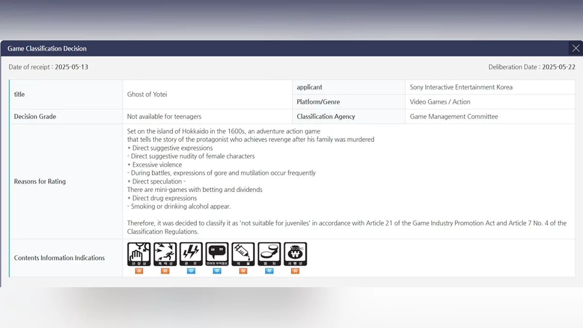 Baru-baru ini, Komite Penilaian dan Administrasi Permainan Korea mengeluarkan penilaian usia untuk Ghost of Yotei. Permainan ini menerima klasifikasi "19+" karena konten seksual, kekerasan grafis, dan aktivitas terkait perjudian.