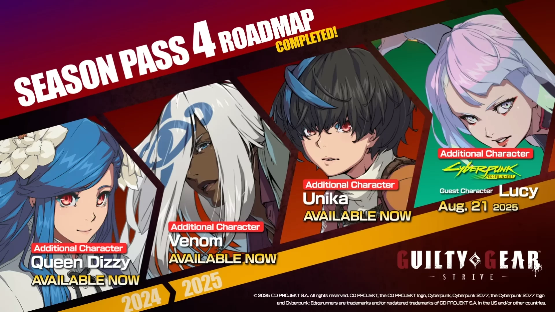 Lucy bergabung dengan Guilty Gear Strive sebagai bagian dari kolaborasi khusus antara Arc System Works dan CD Projekt RED. Dia akan ditambahkan ke dalam permainan pada 21 Agustus dan akan tersedia untuk pemilik season pass keempat (Steam, Microsoft Store, PS4, dan PS5).