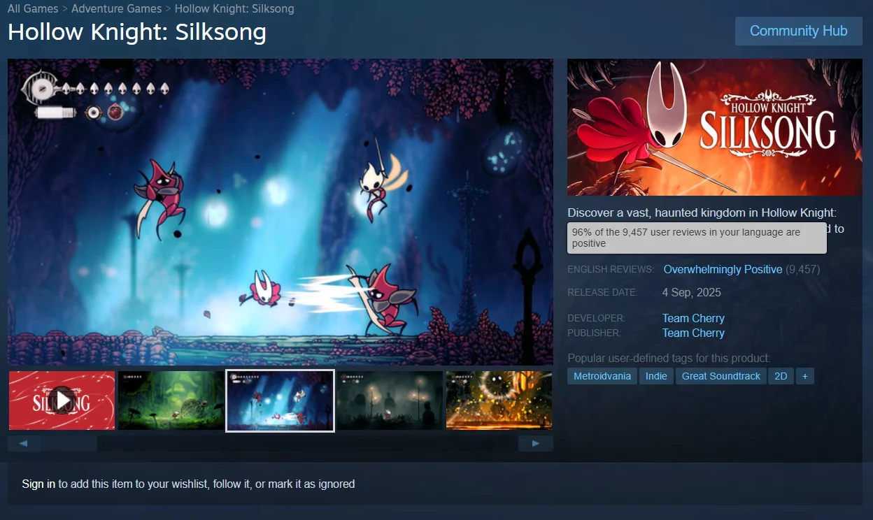 Pada tanggal 4 September, metroidvania yang sangat dinantikan Hollow Knight: Silksong akhirnya diluncurkan. Jumlah pemain yang sangat banyak membuat server Steam kewalahan, sehingga halaman toko game tersebut sementara tidak dapat diakses. Dalam waktu hanya satu hari, Silksong mendapatkan lebih dari 9.000 ulasan positif. Pada saat penulisan, peringkatnya berada di angka yang mengesankan yaitu 96%.