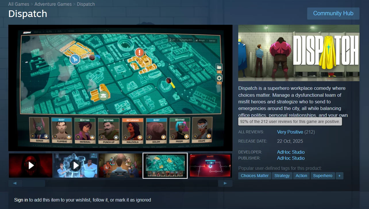 Dispatch, sebuah permainan komedi interaktif yang dikembangkan oleh AdHoc Studio — sebuah tim yang didirikan pada tahun 2018 oleh mantan pengembang Telltale — baru saja diluncurkan di Steam dan PlayStation 5. Pada saat penulisan, permainan ini memiliki rating 92%.