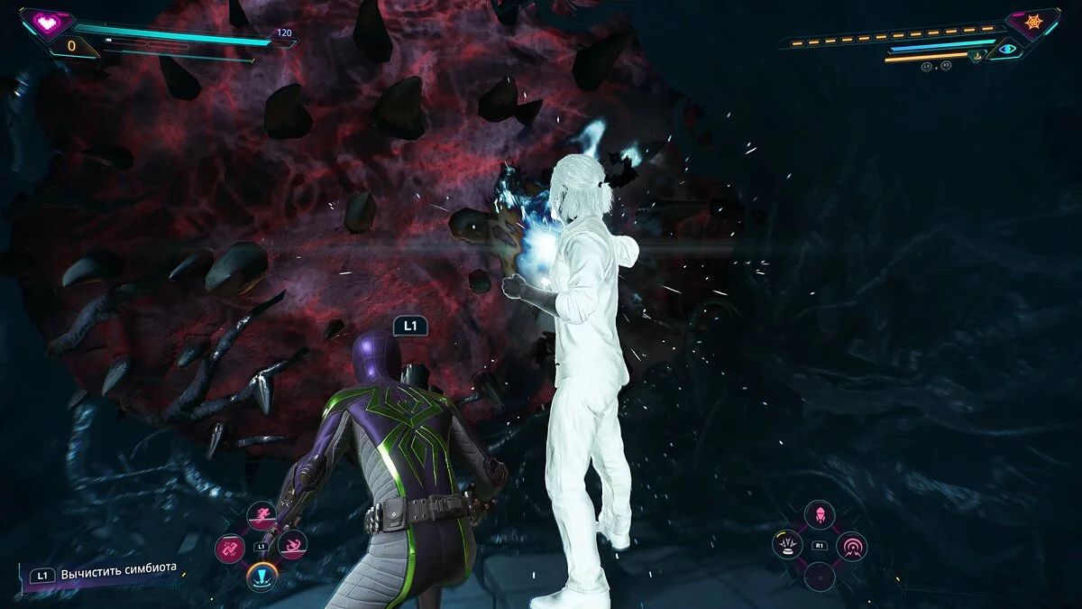 Bermain sebagai Peter. Anda akan memiliki kemampuan baru yang tersedia, terkait dengan keterampilan anti-racun. Uji mereka pada lawan biasa. Segera raksasa symbiote akan muncul di arena. Tembakan jaring tidak berguna melawannya. Gunakan gerakan khusus dan serangan biasa.
