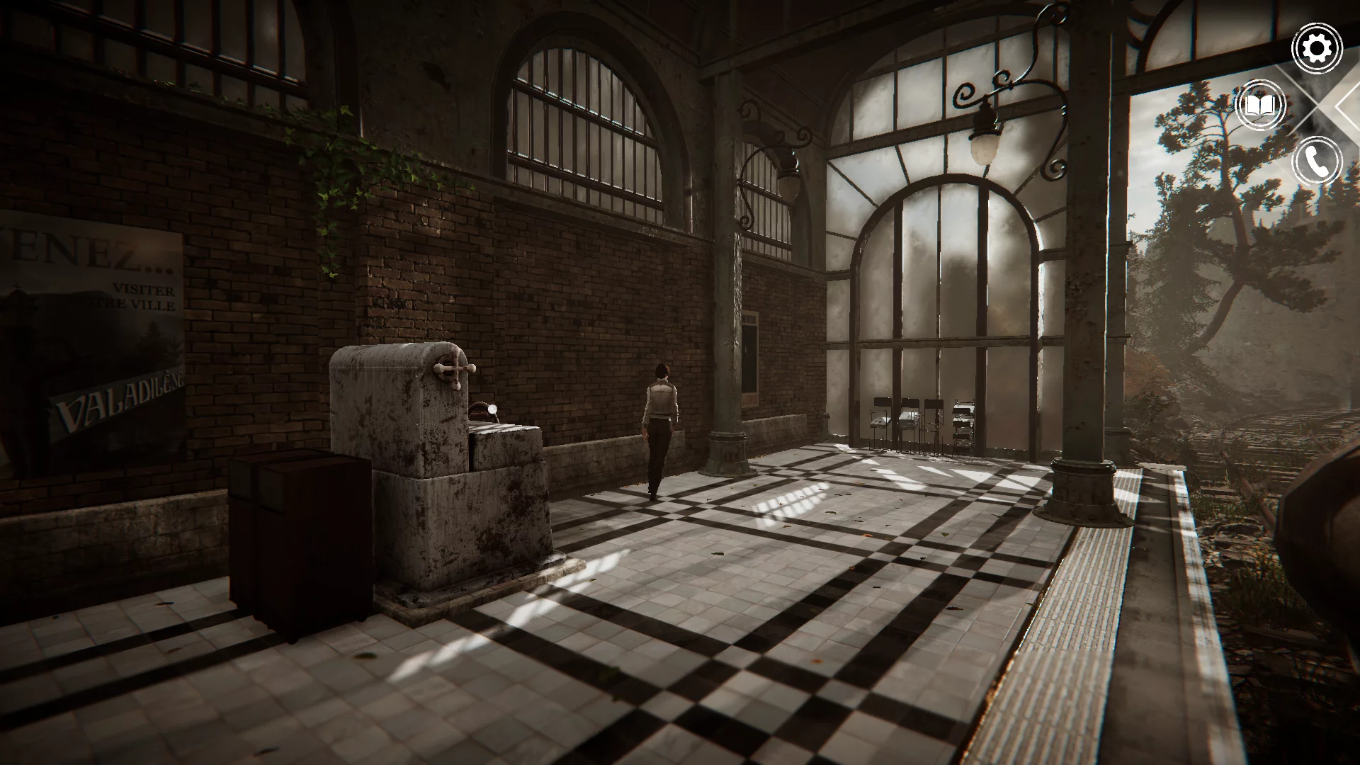 Kate Walker tiba di kota kecil Alpen Valadilene. Segera setelah cutscene pengantar, Anda akan menemukan diri Anda di lobi hotel yang nyaman. Lihatlah sekitar dan dekati koper Kate yang berdiri di dekatnya. Klik "Periksa" untuk mendengar komentar sang pahlawan. Setelah itu, perhatikan dinding di belakang Anda — ada brosur iklan kecil yang terpasang. Dekatlah dan ambil itu. Ini berisi informasi tentang pabrik automaton, yang akan berguna nanti.