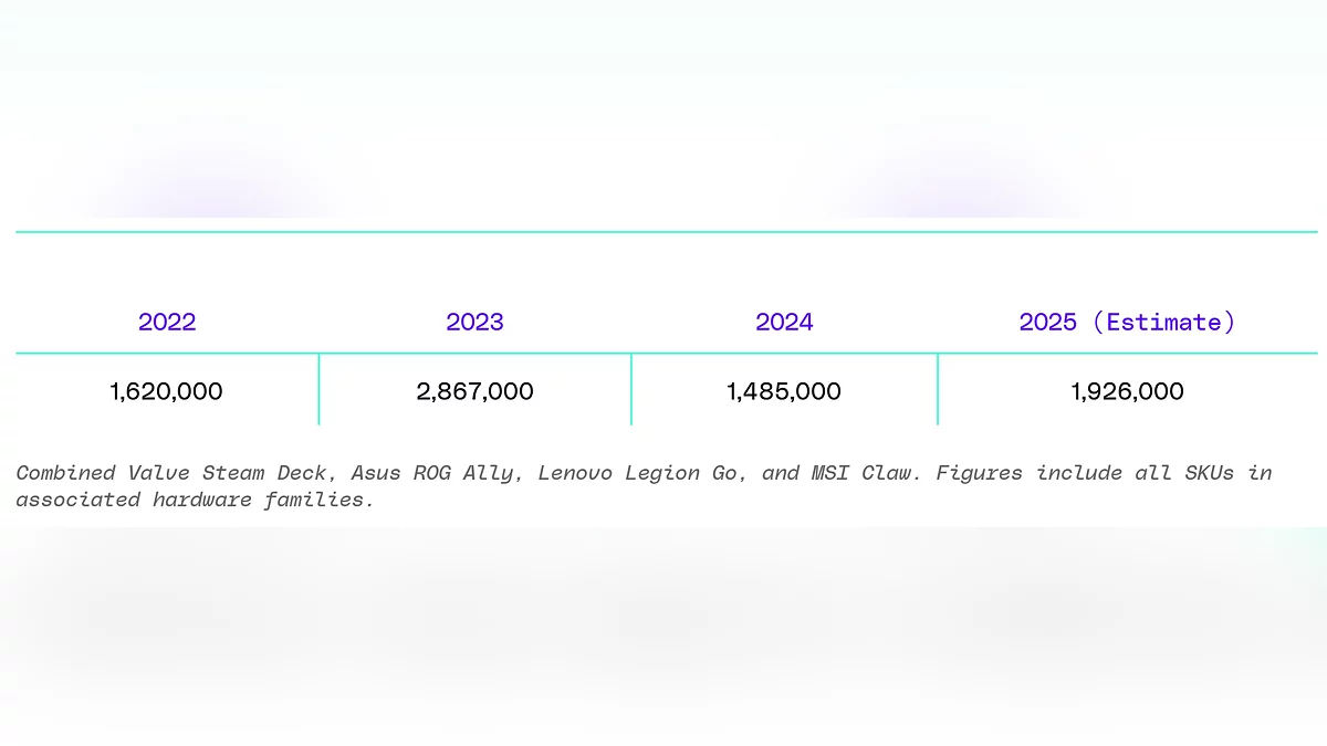 Sebelum 2022, PC gaming portabel adalah pasar niche yang terutama untuk penggemar, dengan perusahaan seperti GPD merilis perangkat dalam jumlah terbatas. Segalanya berubah dengan peluncuran Steam Deck. Menurut IDC, Valve menjual sekitar 4 juta unit hanya dalam dua tahun. Bahkan dengan ketersediaan ritel yang terbatas dan hampir tidak ada iklan di luar platform Steam, kreasi Valve mengungguli semua pesaing, dari ASUS ROG Ally hingga MSI Claw. Namun, analis skeptis tentang pertumbuhan yang berkelanjutan: setelah mencapai puncaknya di 2,87 juta unit pada 2023, penjualan turun menjadi 1,49 juta pada 2024, dengan pemulihan moderat menjadi 2 juta yang diharapkan pada 2025.