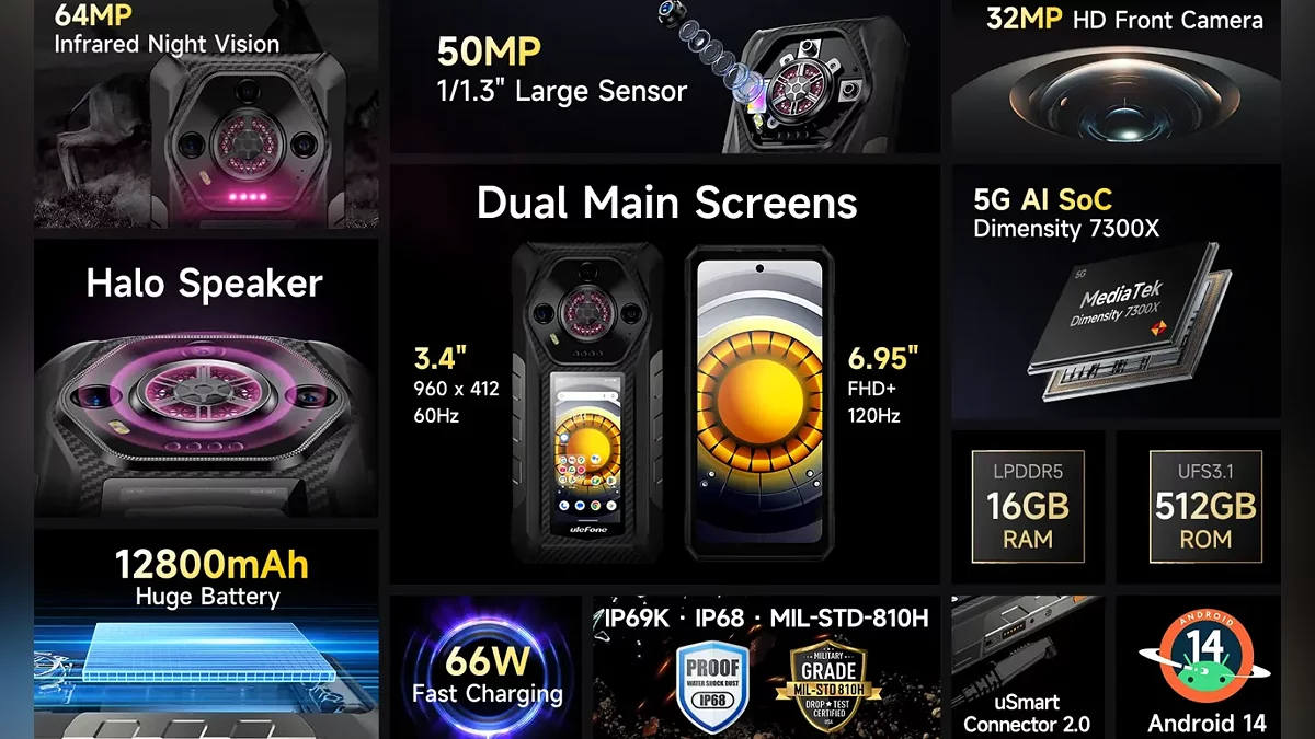 Di dalamnya, ponsel ini ditenagai oleh chip Dimensity 7300X yang dioptimalkan untuk penggunaan dual-screen, dipadukan dengan 16 GB RAM dan penyimpanan yang besar sebesar 512 GB. Untuk lingkungan yang gelap gulita, terdapat kamera malam 64 MP yang dilengkapi dengan LED inframerah dan algoritma NightElf 3.0 dari Ulefone, yang dapat menangkap apa yang tidak dapat ditangkap oleh kamera mode malam biasa. Kamera utama 50 MP didukung oleh sensor ultra-lebar untuk pengambilan gambar yang lebih luas.