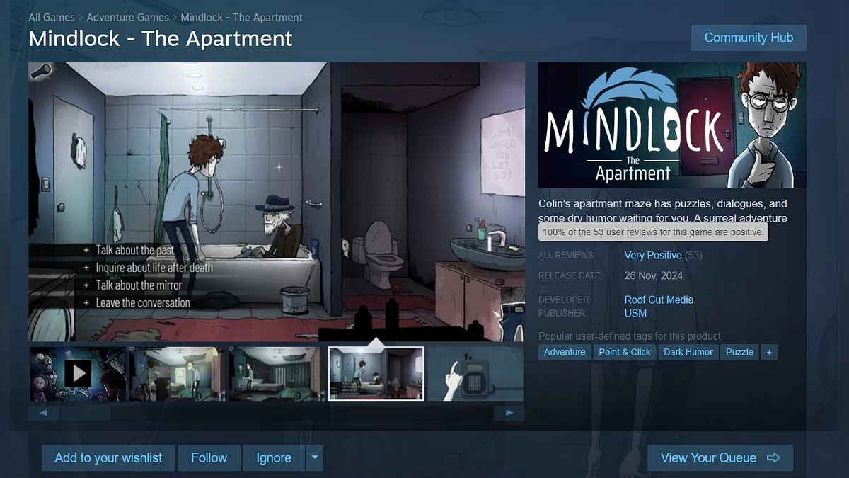 Publisher USM dan pengembang Roof Cut Media baru-baru ini merilis permainan petualangan point-and-click berjudul Mindlock — The Apartment di Steam. Hingga tulisan ini dibuat, permainan ini memiliki rating positif 100% dari pemain.