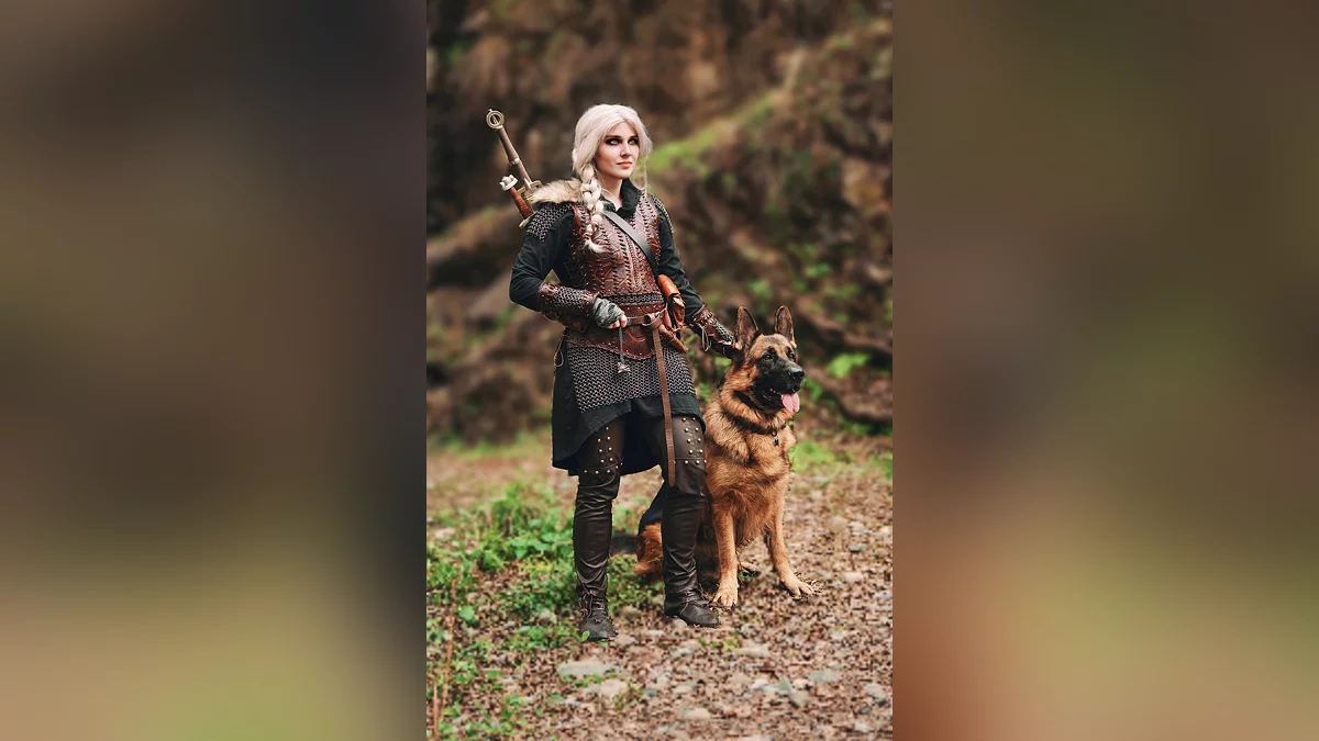 Cosplayer tersebut berpose bersama anjing German shepherd sambil mengenakan armor. Pelindung dada dipinjam dari kostum lain, tetapi pedang Witcher sudah ada di tempatnya.
